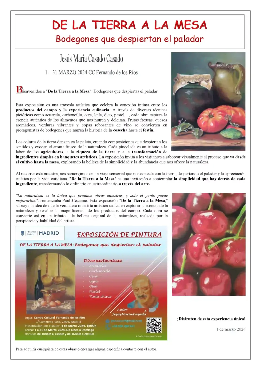 Este vídeo muestra cada obra de la exposición titulada: «DE LA TIERRA A LA MESA, Bodegones que despiertan el Paladar» realizada en el Centro Cultural Fernando de los Ríos, con un resumen de audio global. Sumérgete en un viaje visual donde arte y gastronomía se entrelazan, revelando la belleza de los bodegones que capturan la esencia de la naturaleza y la cultura culinaria. Disfruta de una experiencia única que despertará tus sentidos. ¡No te lo pierdas!