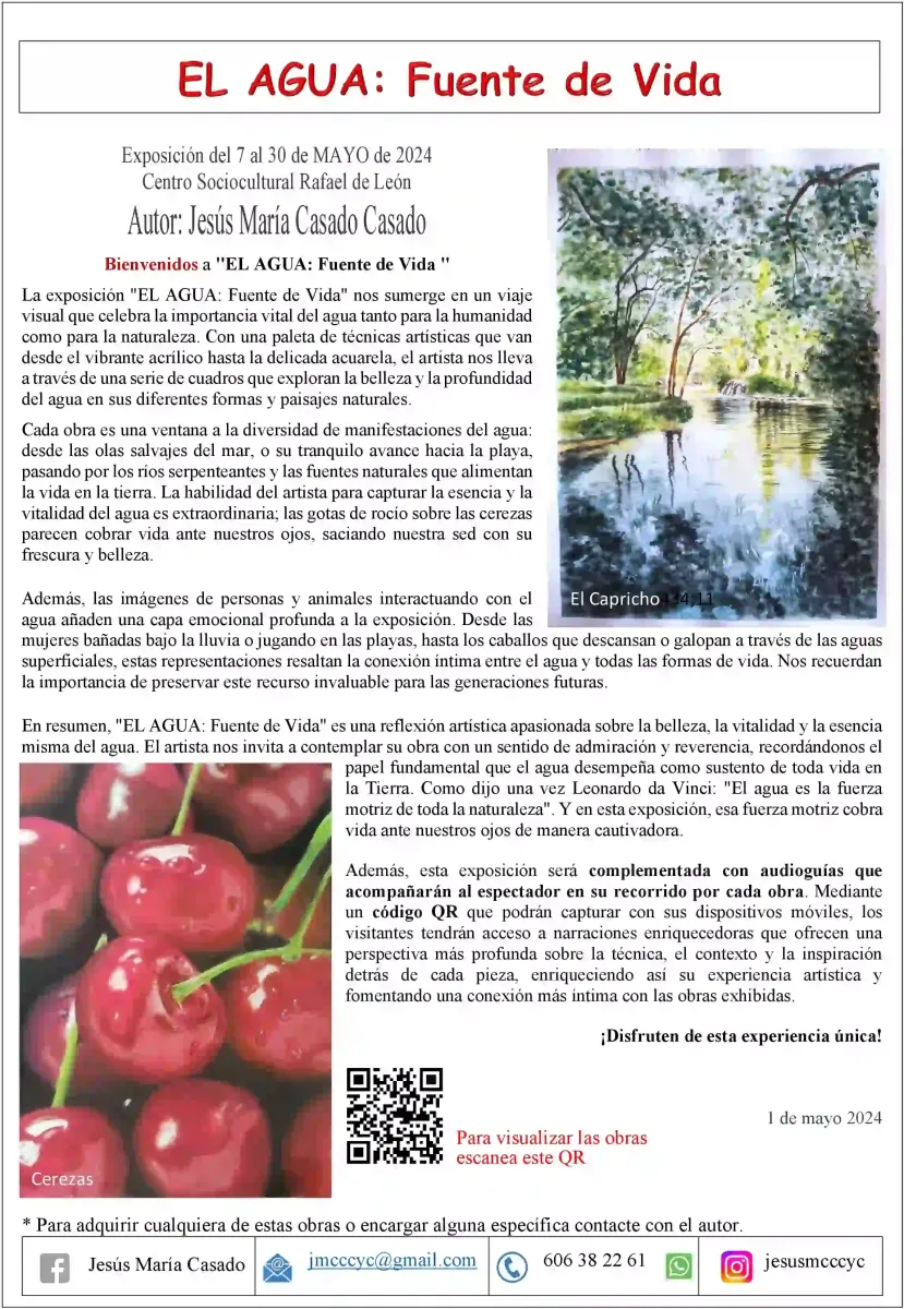 En el próximo video, les ofreceremos una panorámica virtual de la sala de exposiciones del Centro Cultural de Rafael de León, donde tuvo lugar la destacada muestra de pintura sobre «EL AGUA, Fuente de Vida », con una síntesis de audio del contenido de la exposición.